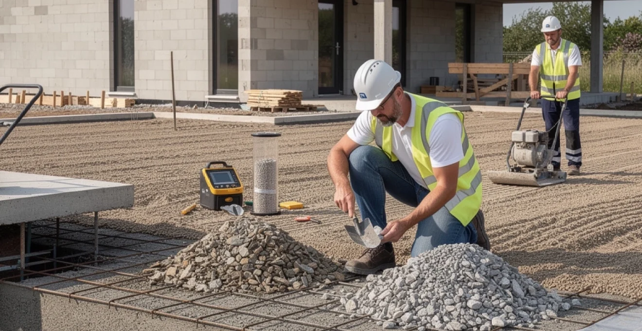 Un gravier trop sale agit comme un lubrifiant entre les grains : le compactage est trompeur, la portance réelle reste faible et les tassements apparaissent rapidement après la mise en charge. Vous pouvez demander au fournisseur la fiche technique du granulat indiquant l’ES mesuré en laboratoire. Sur chantier, un simple contrôle visuel (poussières, particules argileuses collantes) et un lavage sommaire dans un seau transparent donnent déjà une première indication sur la propreté du matériau livré.